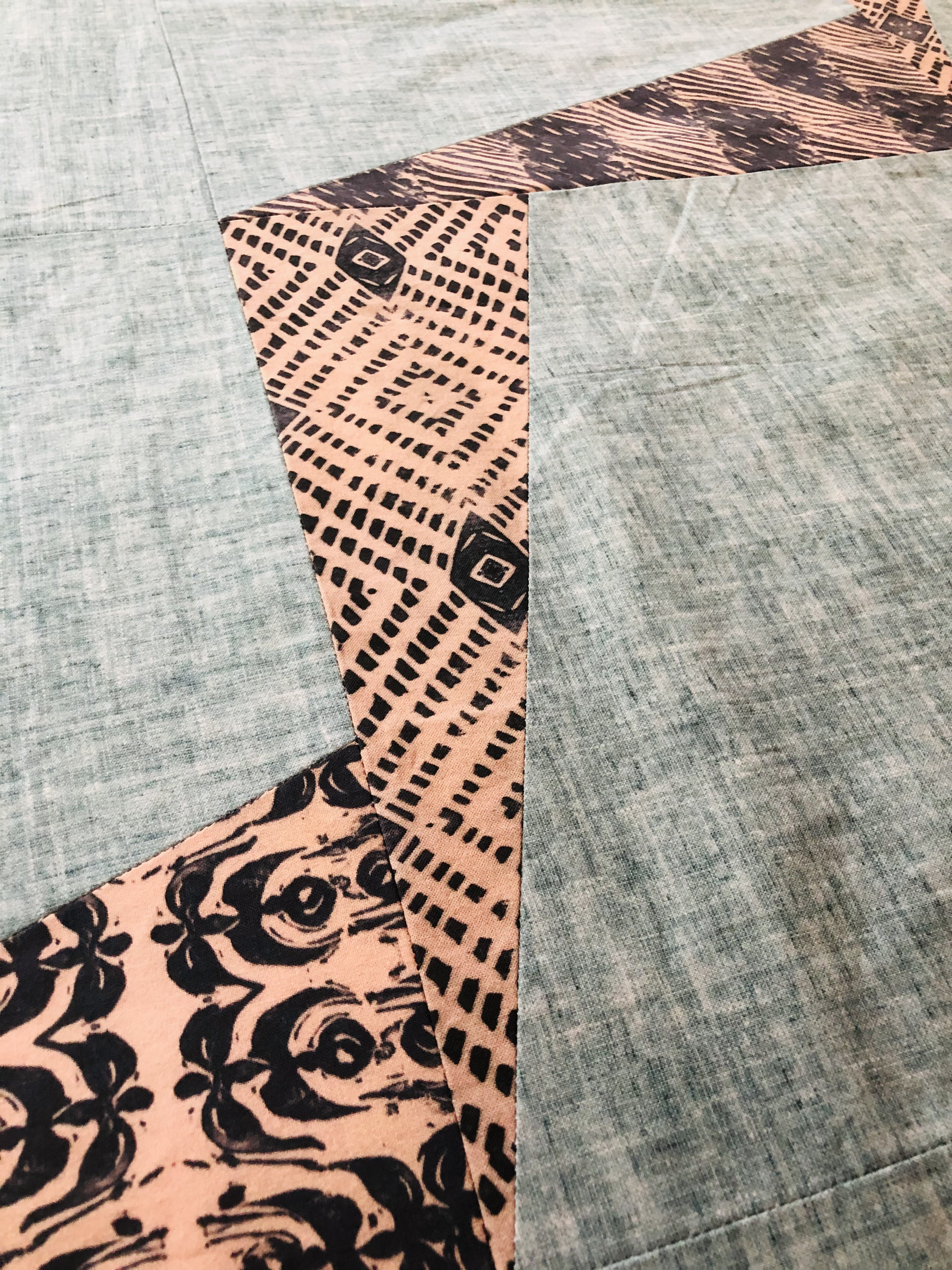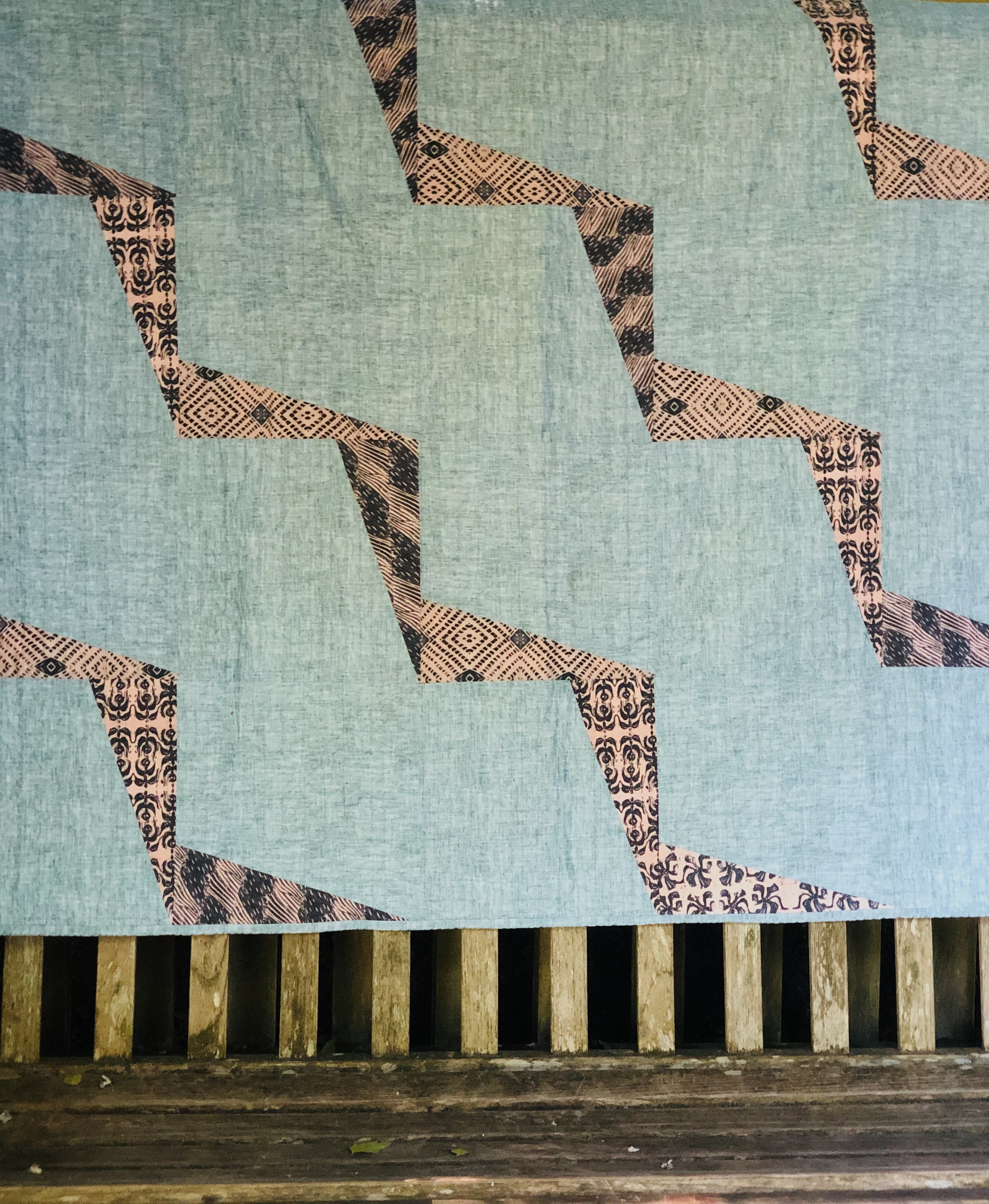 Fan quilt 65″ x 65″. A selection of block print fabrics hand quilted over 100% cotton batting. Photographed at Parson’s Garden in Seattle, Washington.