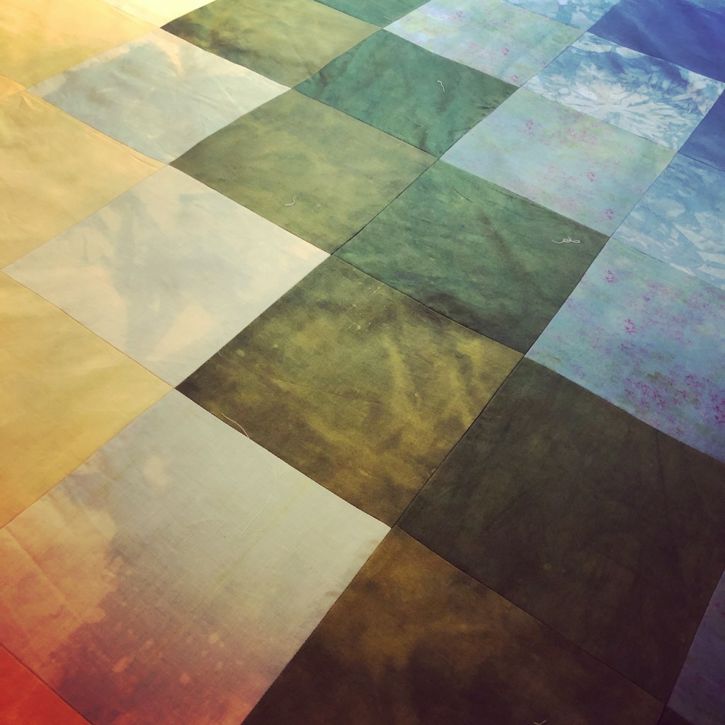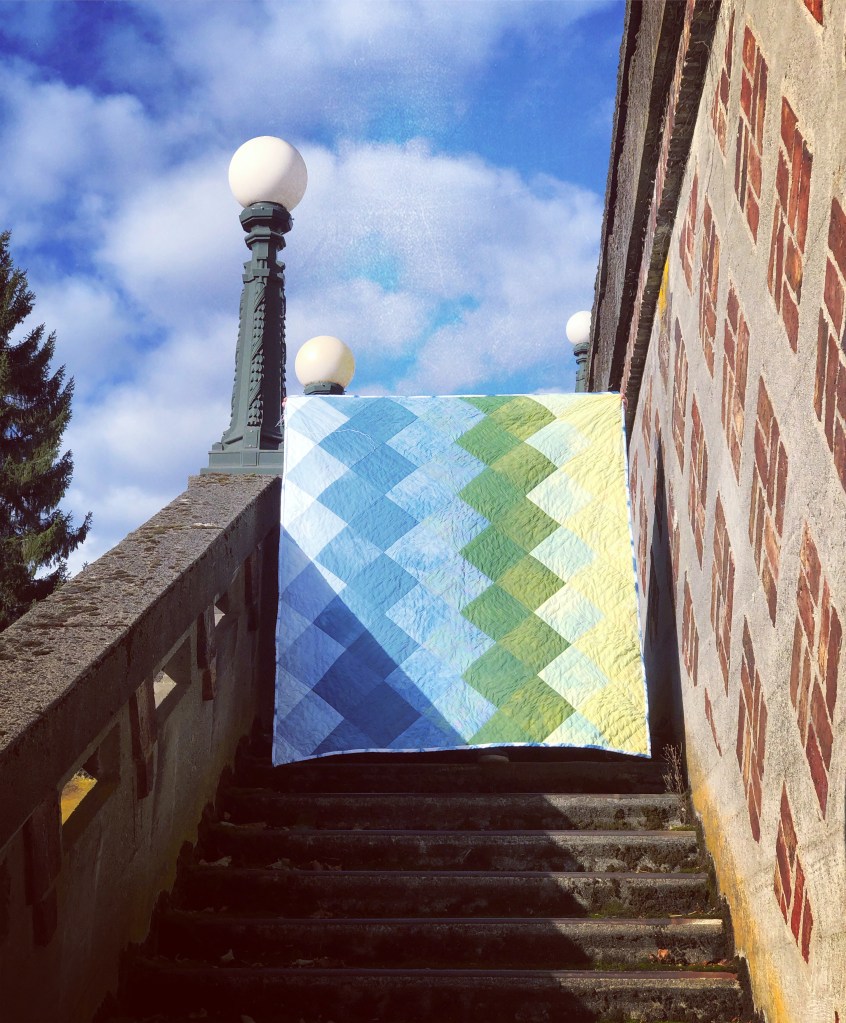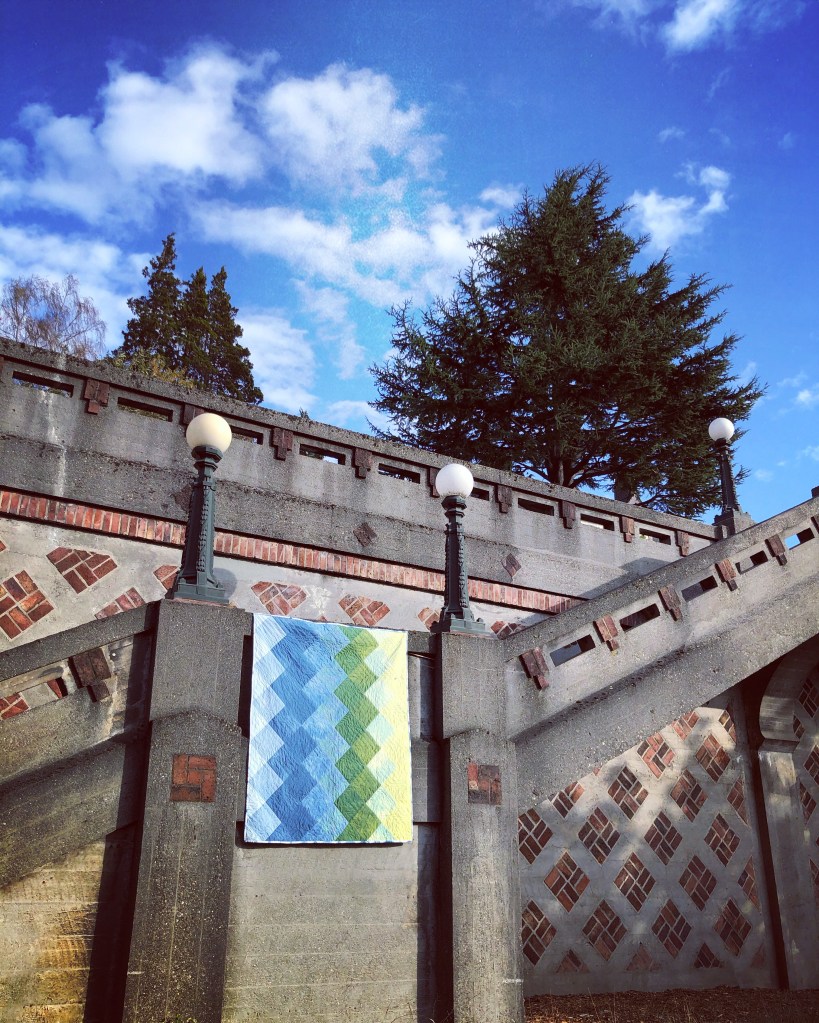 Land quilt, 50″ x 68″. Hand quilted in the Summer of 2020. This piece was a collection of cotton remnants that were hand dyed using both indigo and turmeric to achieve the various colors. It reminds me of a bird’s-eye view moving between irrigated and arid land. Photographed at Wilcox Wall in Seattle, Washington.