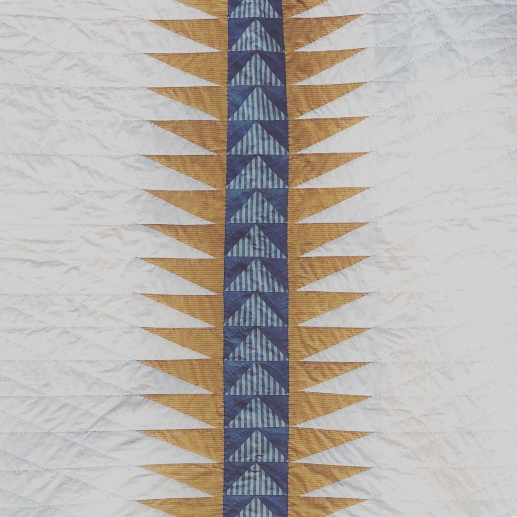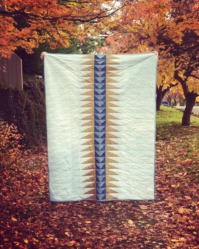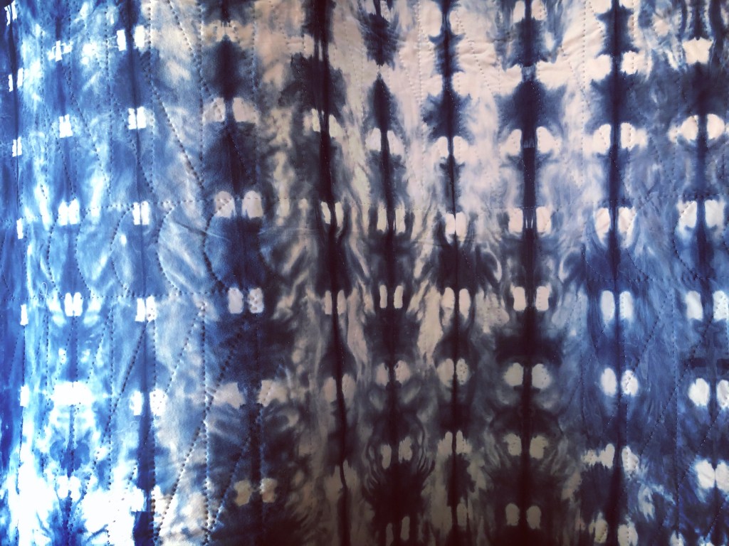 Path quilt, 68″ x 56″. Hand quilted in Fall of 2000 with cotton remnants over-dyed in indigo. Back side (center) is a soft organic cotton knit dyed with indigo using shibori technique. Photographed in Seattle, Washington. *AVAILABLE FOR PURCHASE*