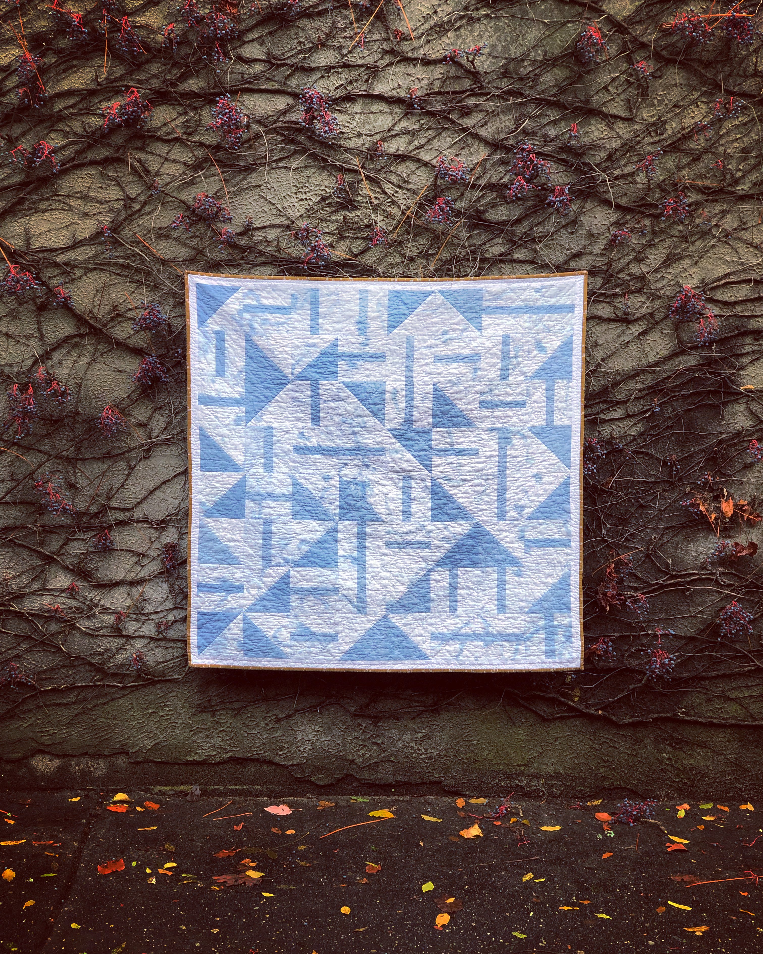 Tile quilt measuring 56″ x 56″ shown front, detail, back in progress. Perfect sizing for a wall hanging. This quilt was created in Summer of 2021 and inspired by a wall tile installation in Belltown, Seattle. Hand quilted with recycled cotton dyed with indigo. The splatter effect was also created with indigo. Photographed along a retaining wall on the west side of Queen Anne, Seattle.
